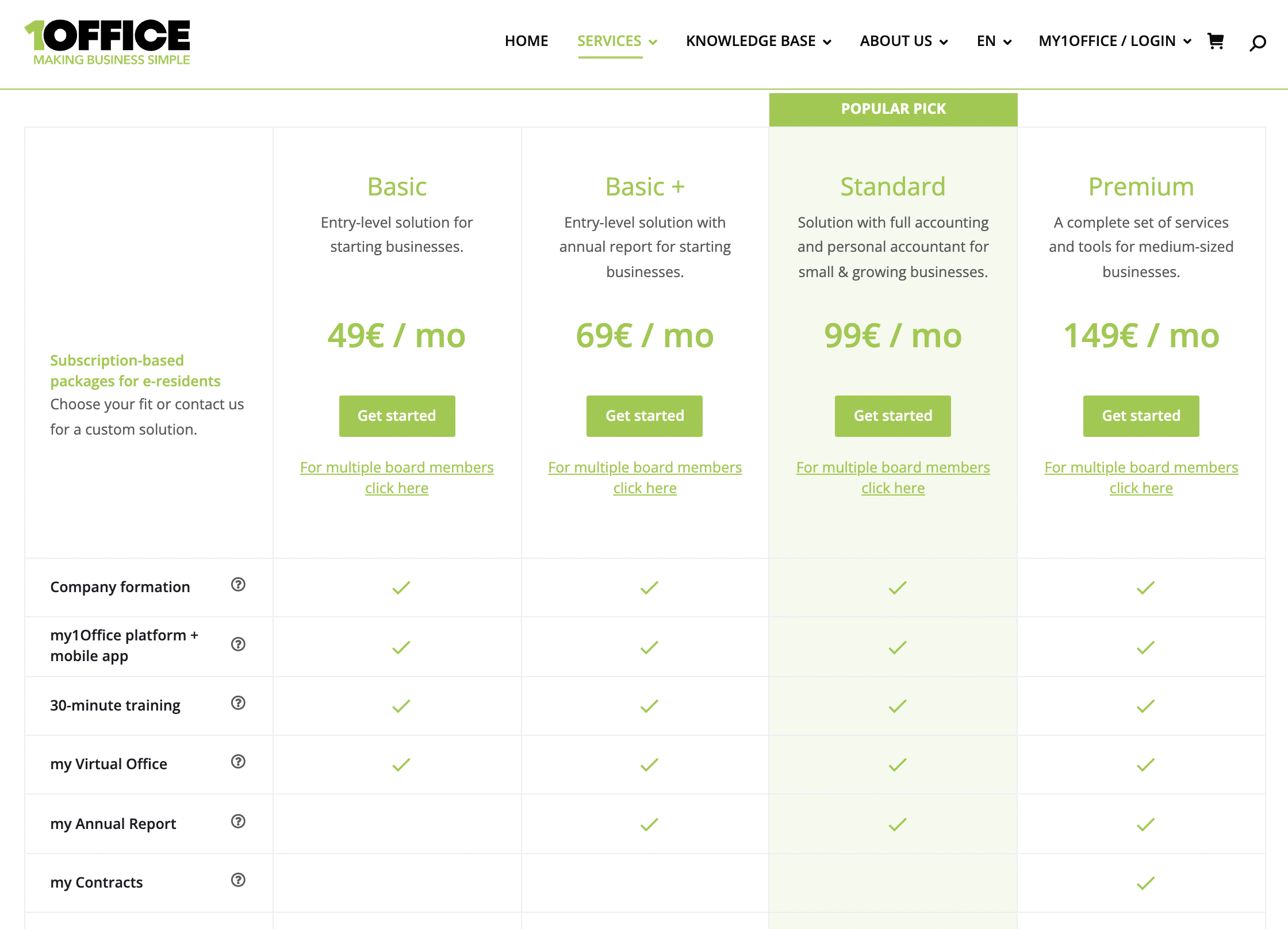You can choose between four packages that each have their own features and tools. As Virtual Office services (legal address and contact person) are mandatory for every Estonian company whose management board is located outside Estonia, the Basic package is the bare minimum you can choose.