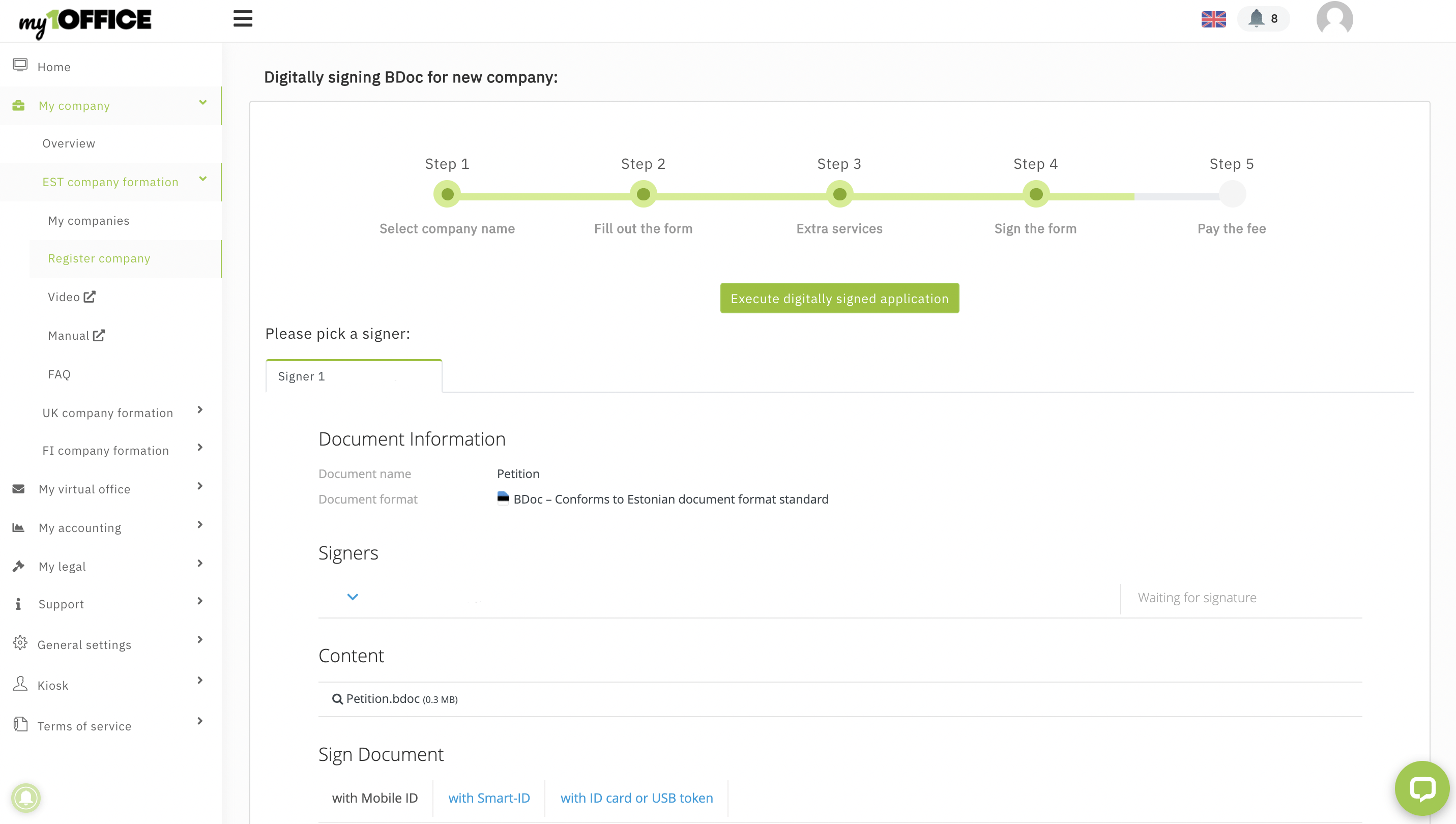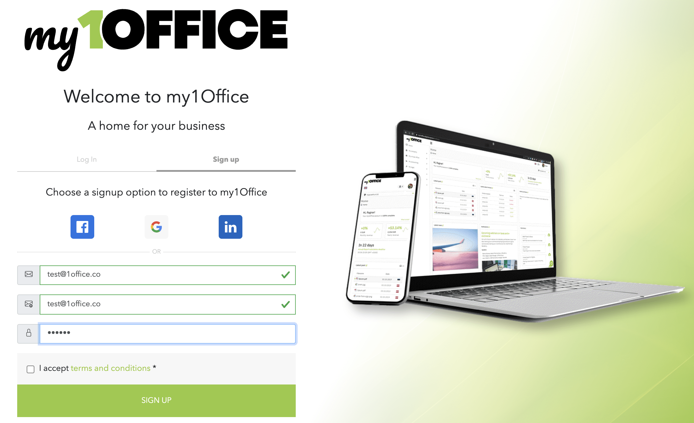 After you have selected the package, you’ll be directed to create an account in my1Office, a special platform that will become a home for your new business. Everything you might need for your new company will be assembled together on this platform.