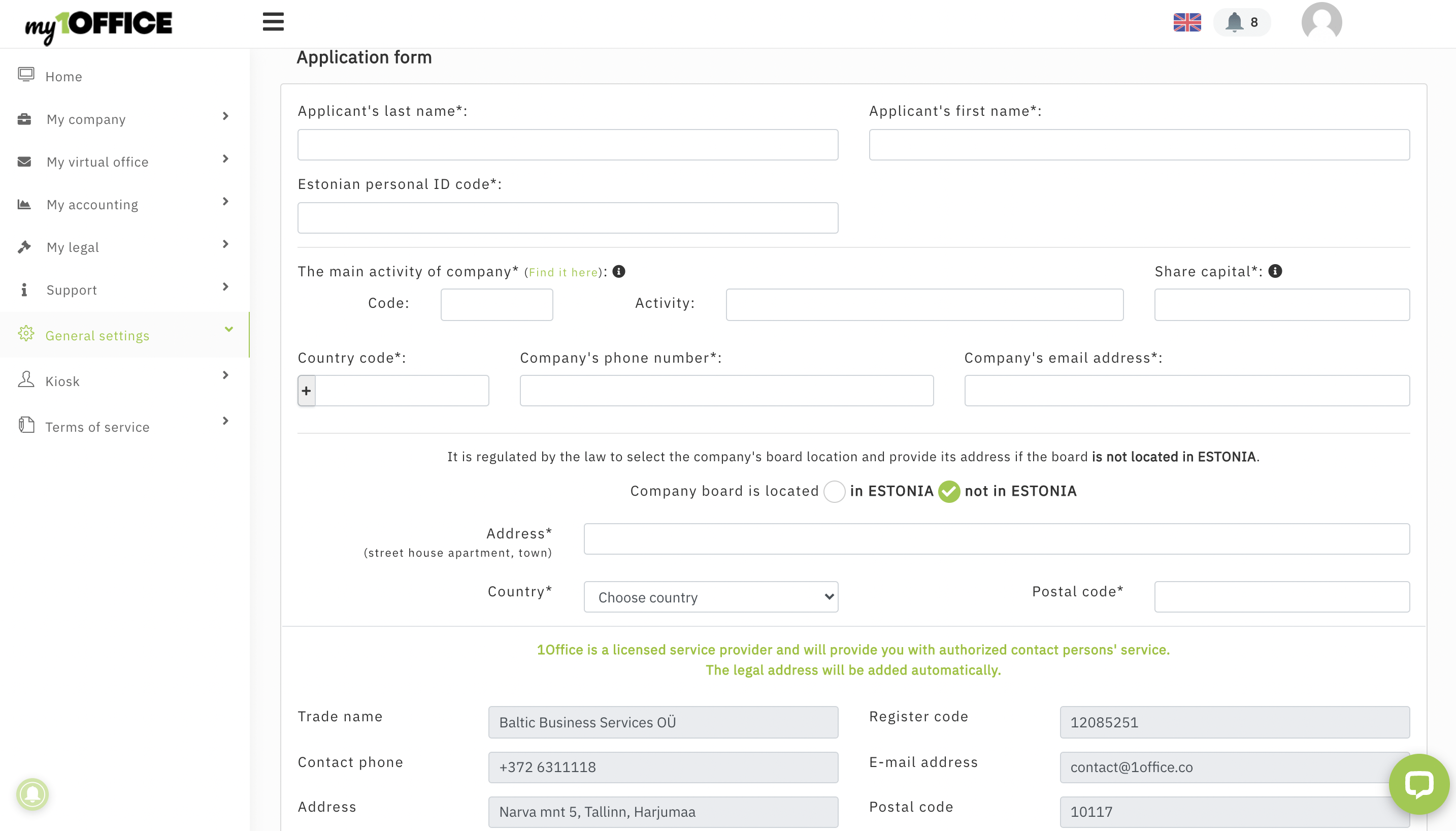 If you are not managing the company from Estonia, check the box that your company’s board is not located in Estonia and the address blanks will be automatically filled with 1Office address information.