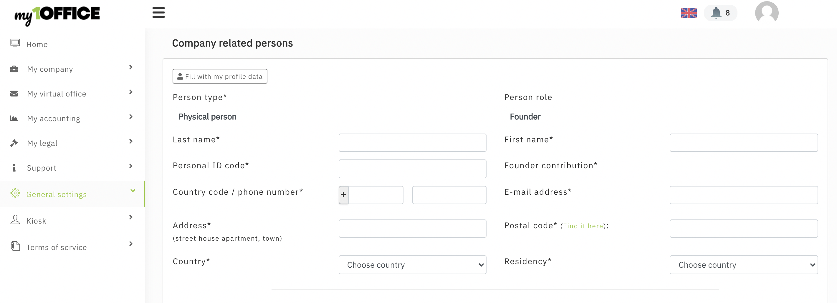TIP: If you are establishing the company for yourself, then the easiest is to choose “Fill with my profile data” for both Founder and Board Member, and you will be done in a second.