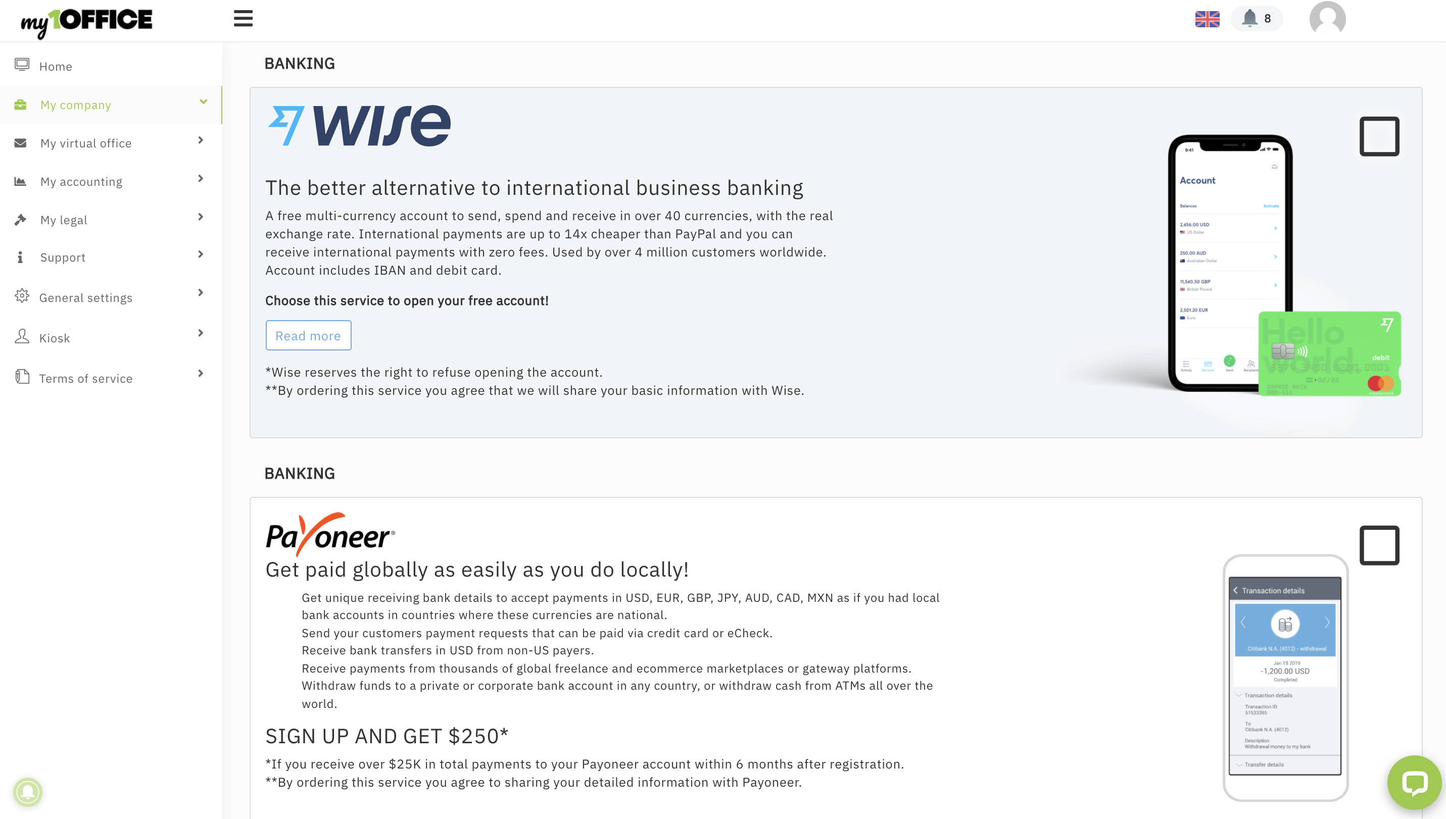 Now you are ready to start with all the business activities and we will start providing services based on the package you chose. Of course, if you need anything extra, you can always turn to us as 1Office offers a large selection of legal and accounting services to companies.