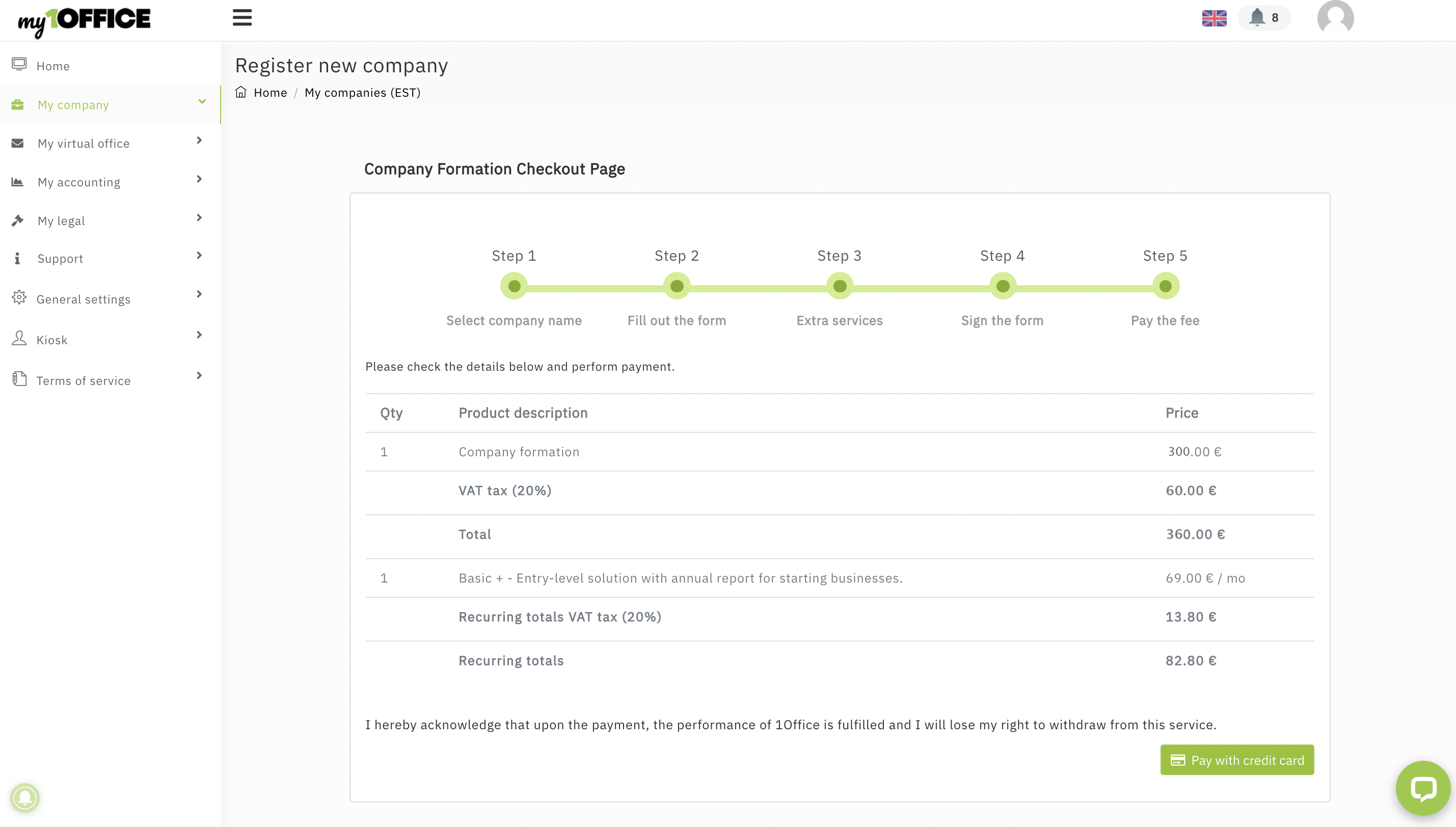Now the last thing left to do is pay the company registration fee of 300 € (that already includes the state fee of 265 €). This screen appears and if everything is as it should, click “Pay with credit card”.