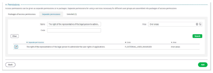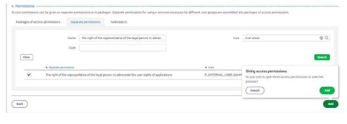 - Tick “The right of the representative of the legal person to administer the user rights of applications“ and click “Add”.