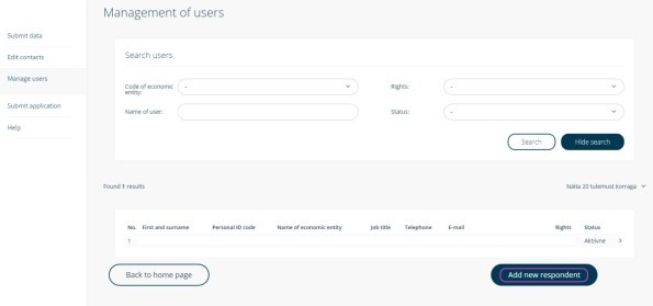 - Add your accountant by pressing “Add new respondent”: Select your company from the drop-down menu and enter your accountant’s details (ID code, name, job title, etc.).