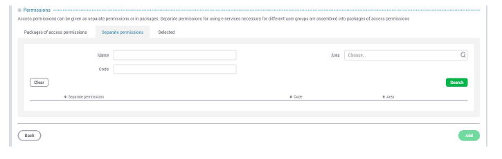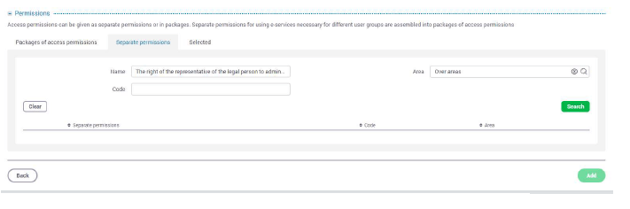 - In the space provided next to “Name” write “The right of the representative of a person to administer the user rights of applications” and select “Over areas” from the list provided next to “Area”, then push the „Search“ button.